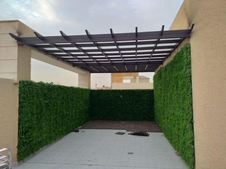 - البرجولات الخشبية: تضفي لمسة كلاسيكية دافئة، وتُصنع عادة من خشب السويدي أو التيك المعالج ضد التسوس والرطوبة.