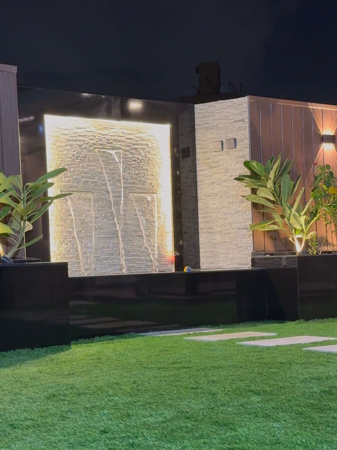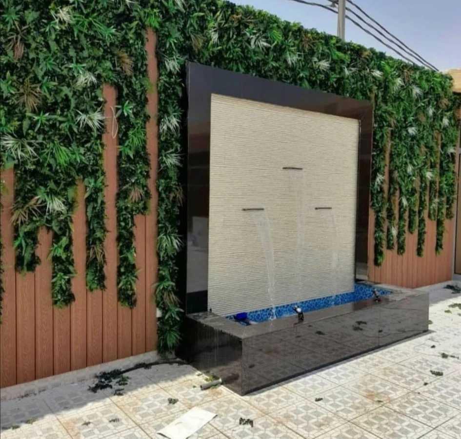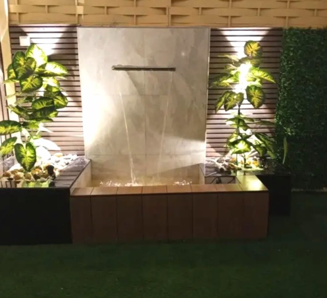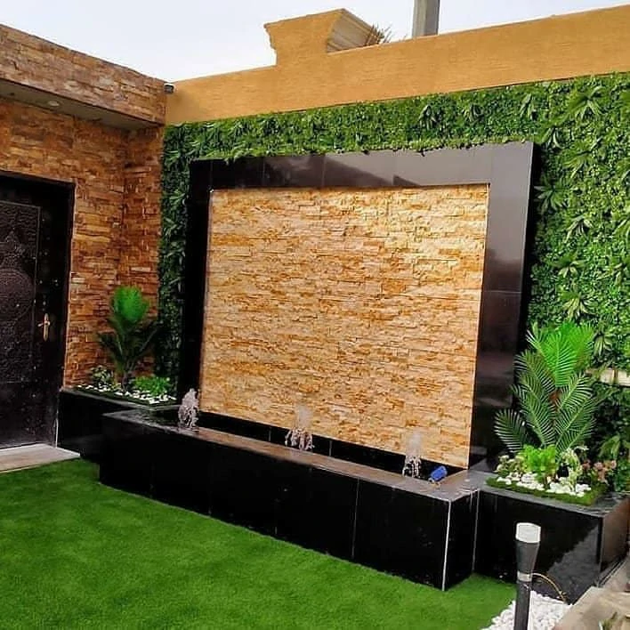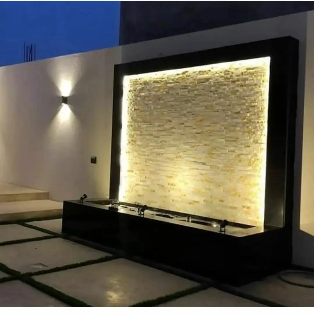 - الشلالات الجدارية: مثالية للمساحات الصغيرة، حيث يتم تركيبها على الأسوار مع إضاءة “LED” مخفية.