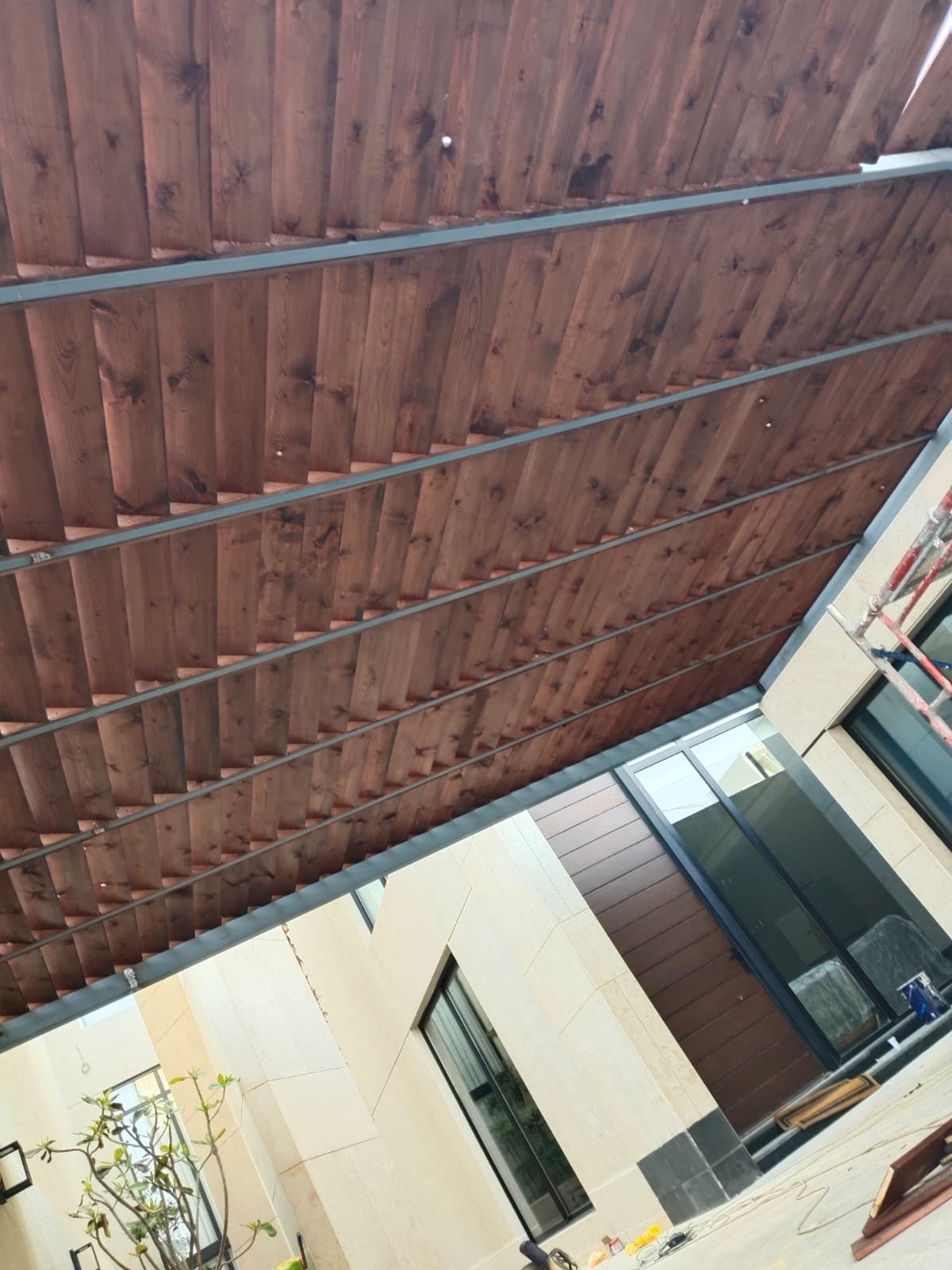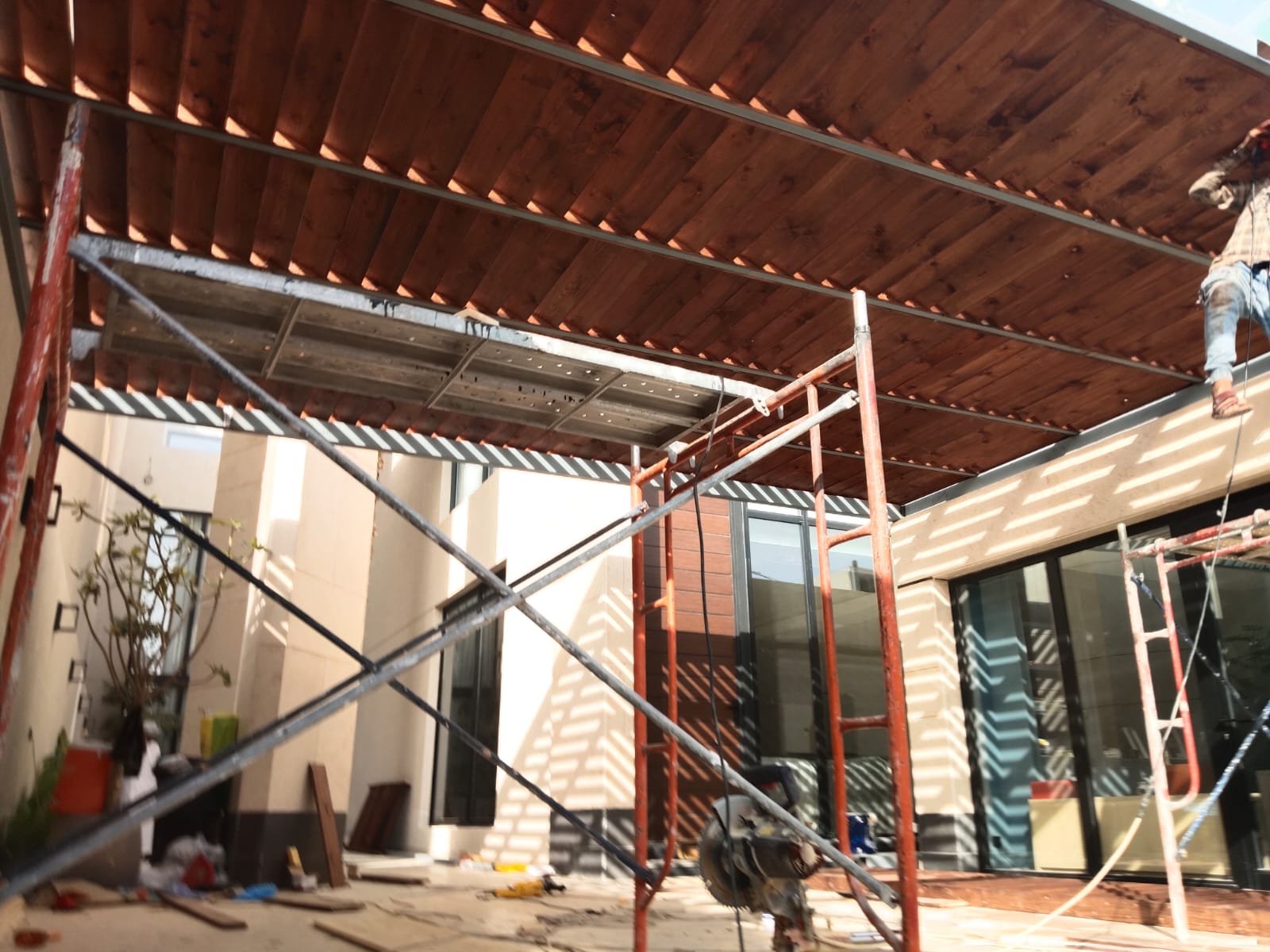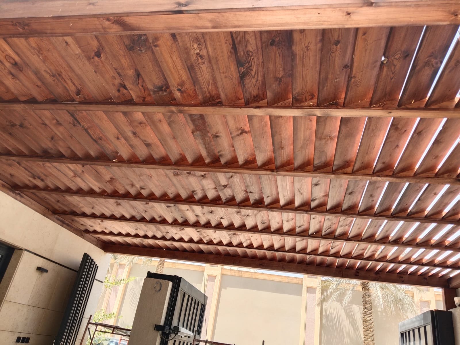 1. ​المظلات الهجين: دمج الهيكل الحديدي مع سقف من شرائح الخشب أو اللكسان الشفاف.