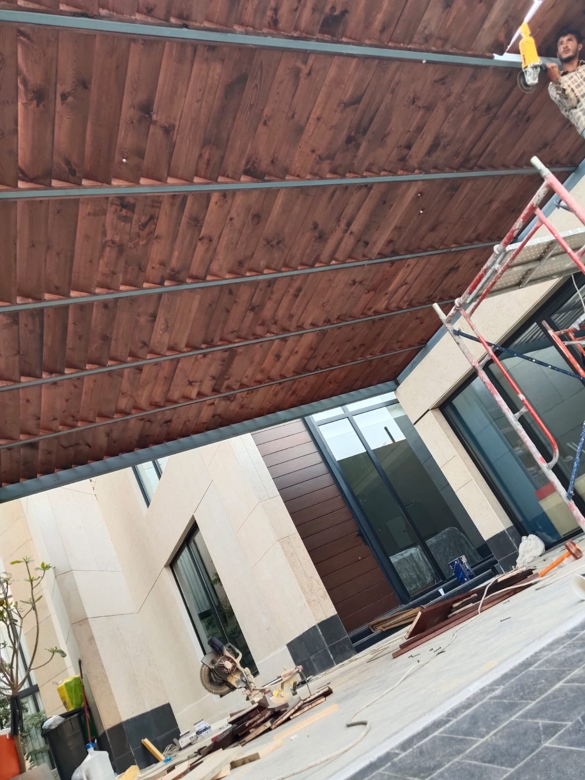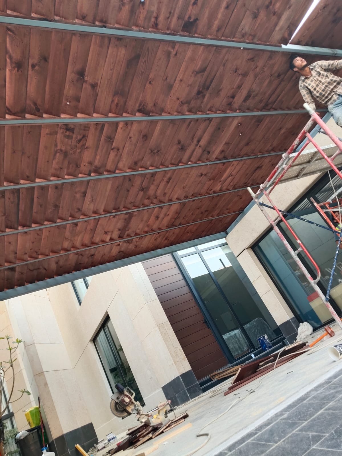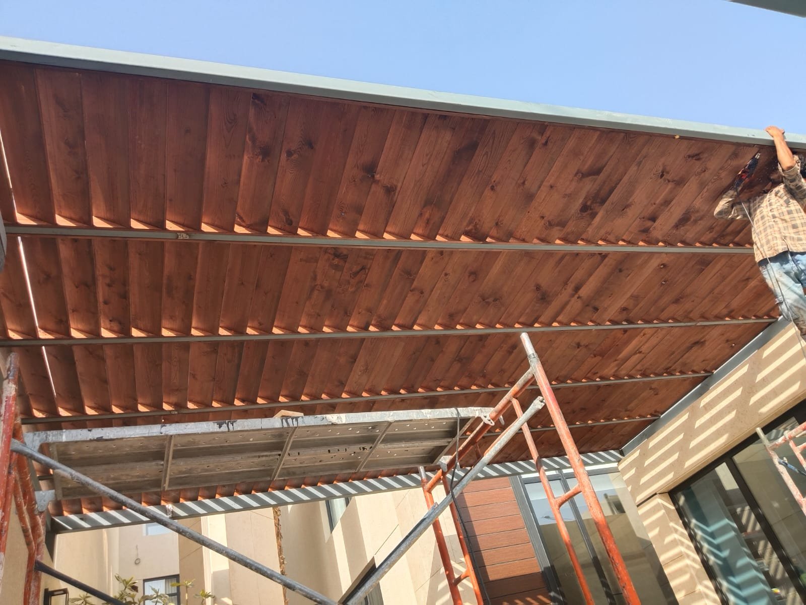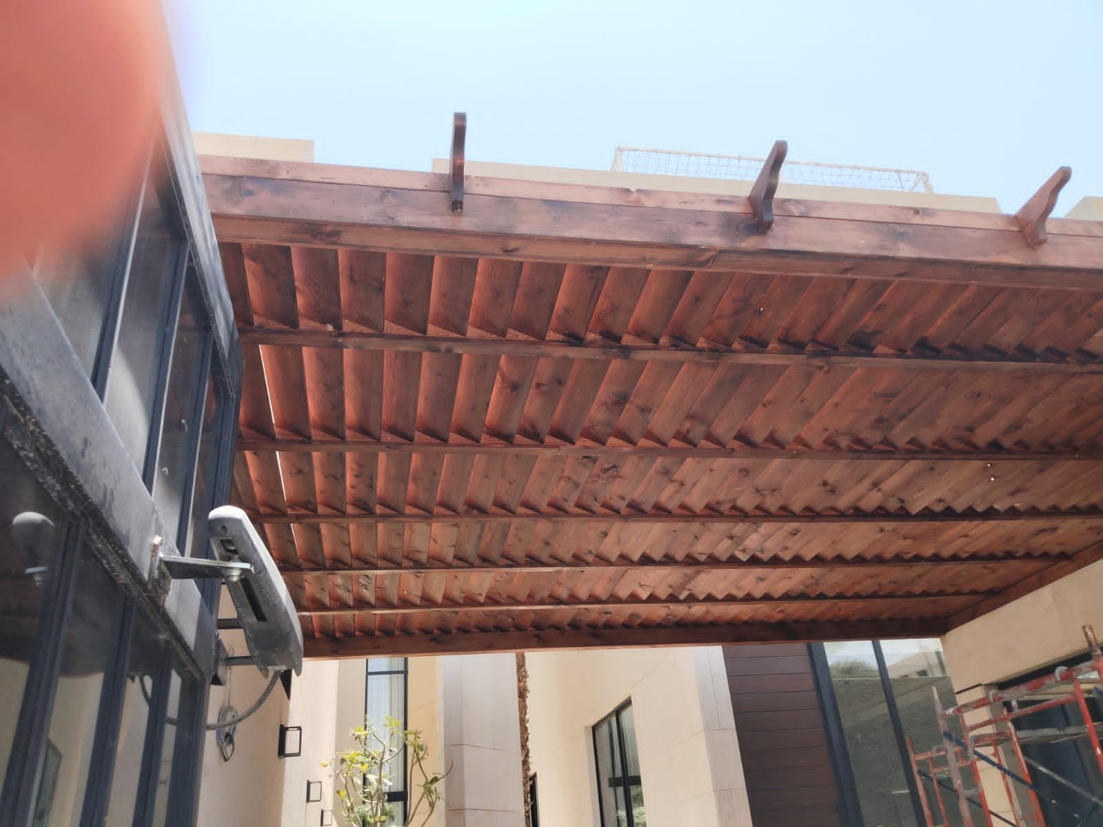 1. ​المظلات الهجين: دمج الهيكل الحديدي مع سقف من شرائح الخشب أو اللكسان الشفاف.