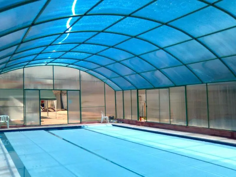 - مظلات اللكسان: مادة شفافة أو شبه شفافة، شبيهة بالزجاج لكنها ضد الكسر. تسمح بمرور الضوء الطبيعي مع حجب الأشعة فوق البنفسجية. تُعتبر الخيار رقم 1 لتغطية المسابح لمنح إضاءة طبيعية مع حماية.