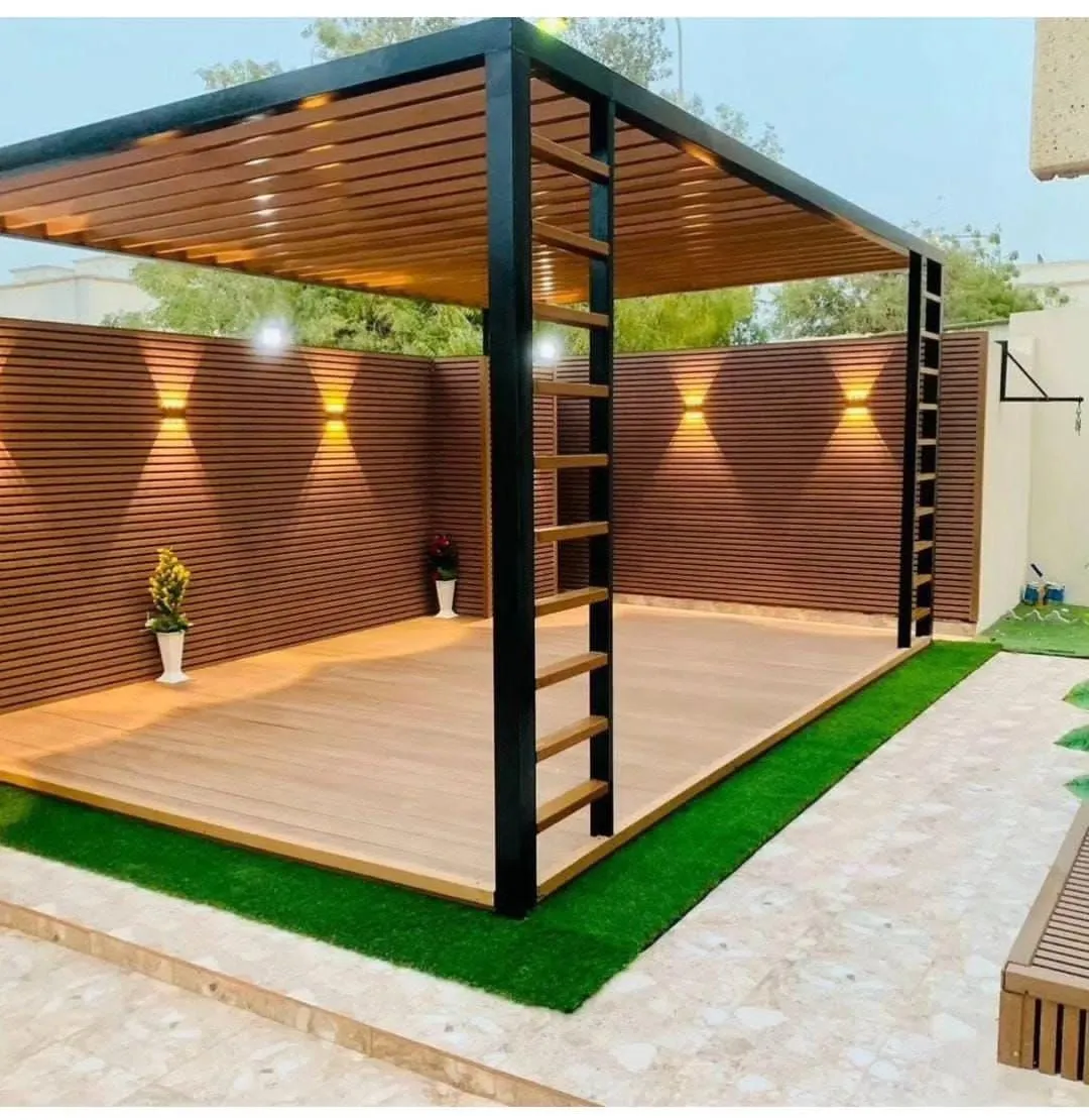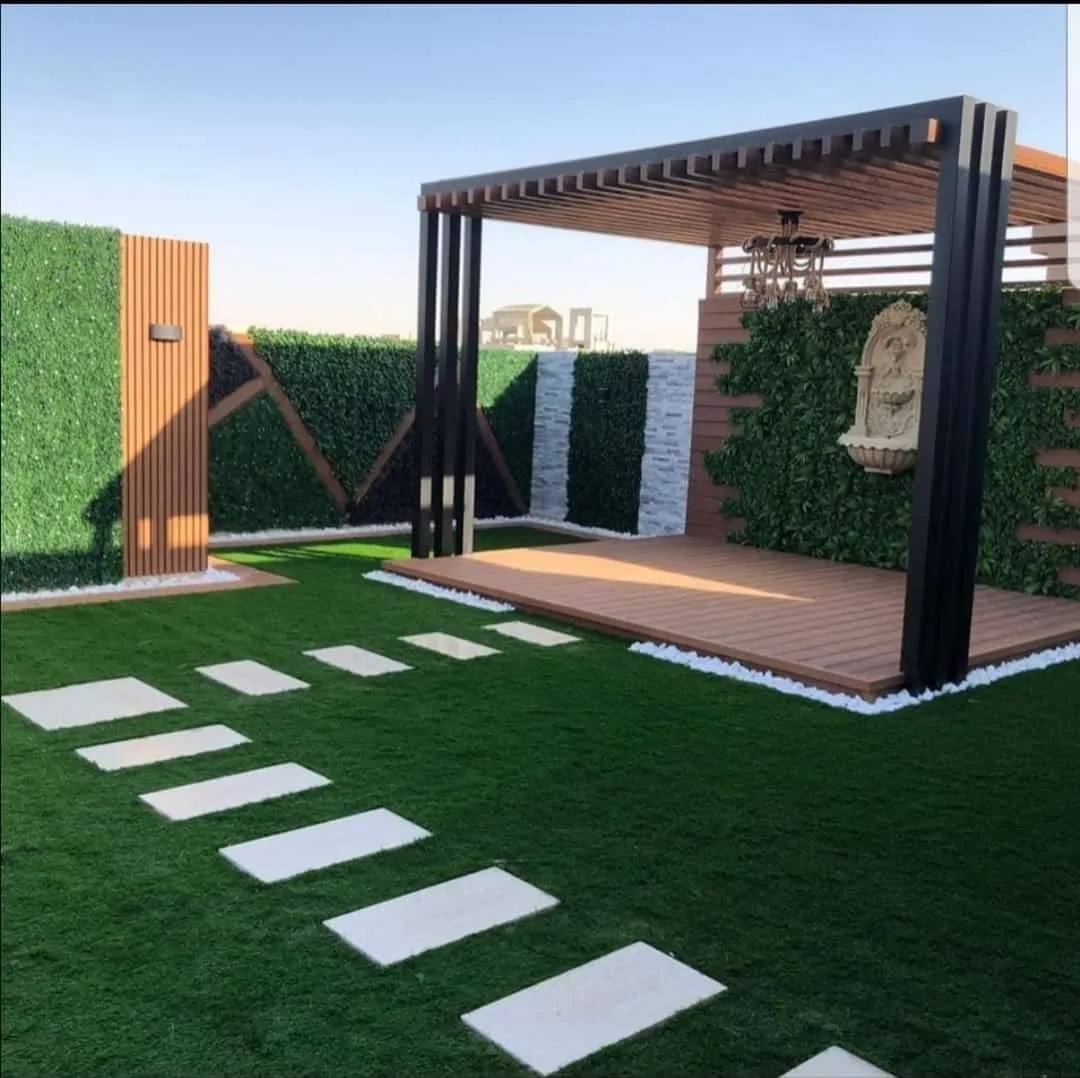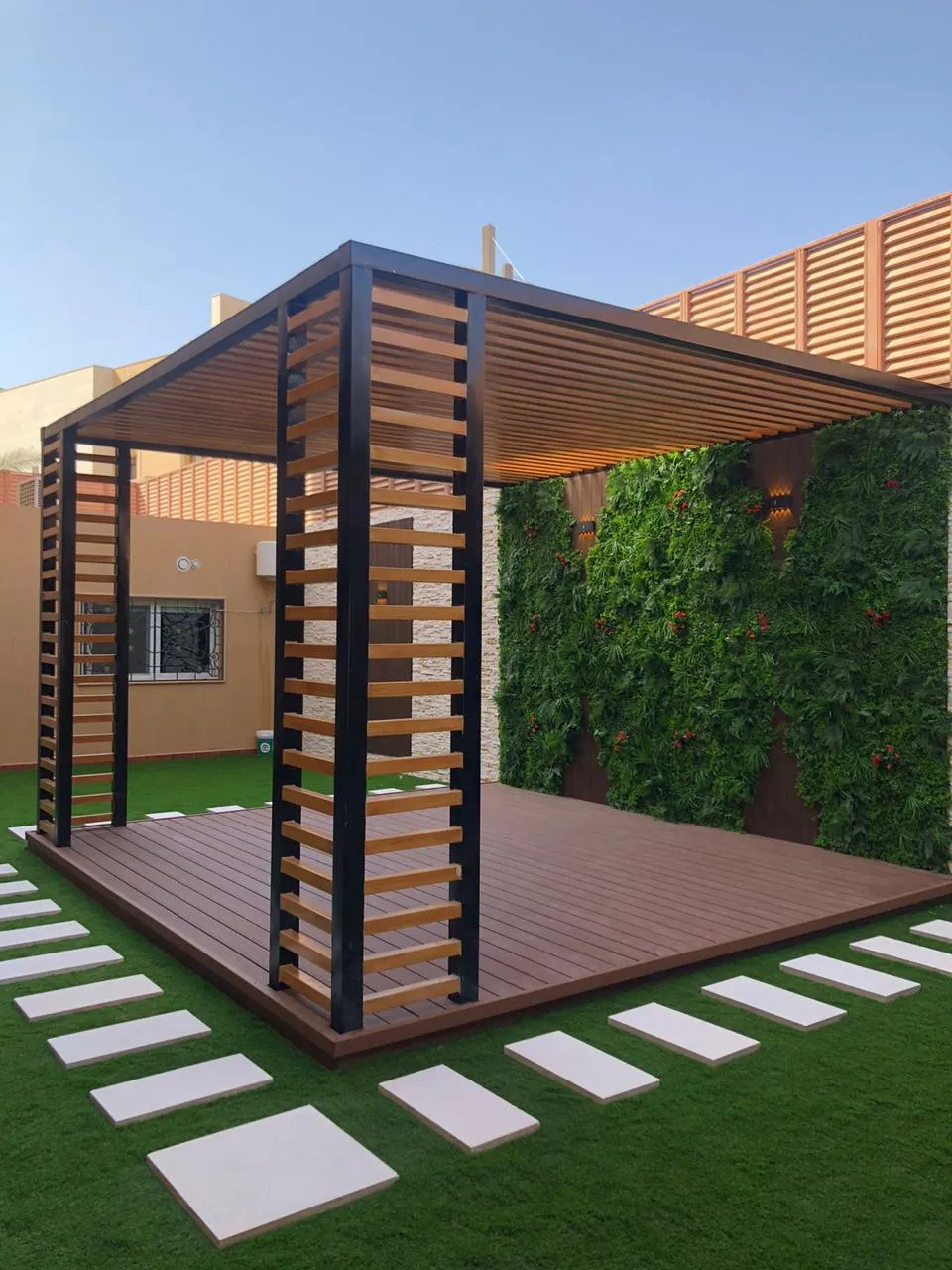 - الجدران النباتية المتكاملة: تصميم البرجولة بحيث تكون مصممة لاستضافة نباتات متسلقة أو دمج نظام حدائق عمودية في أعمدتها، مما يحول البرجولة إلى جزء حيوي من البيئة بدلاً من مجرد هيكل إضافي.