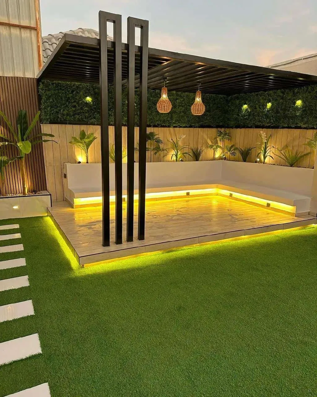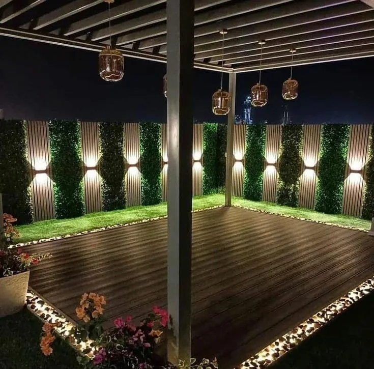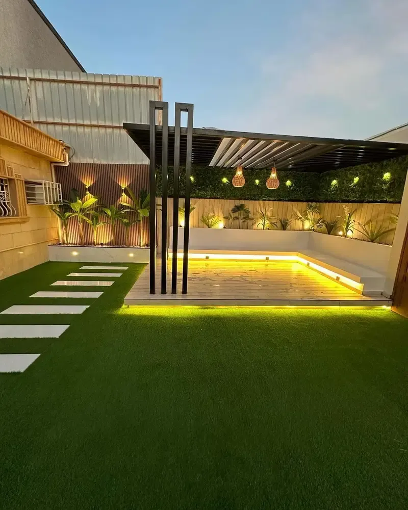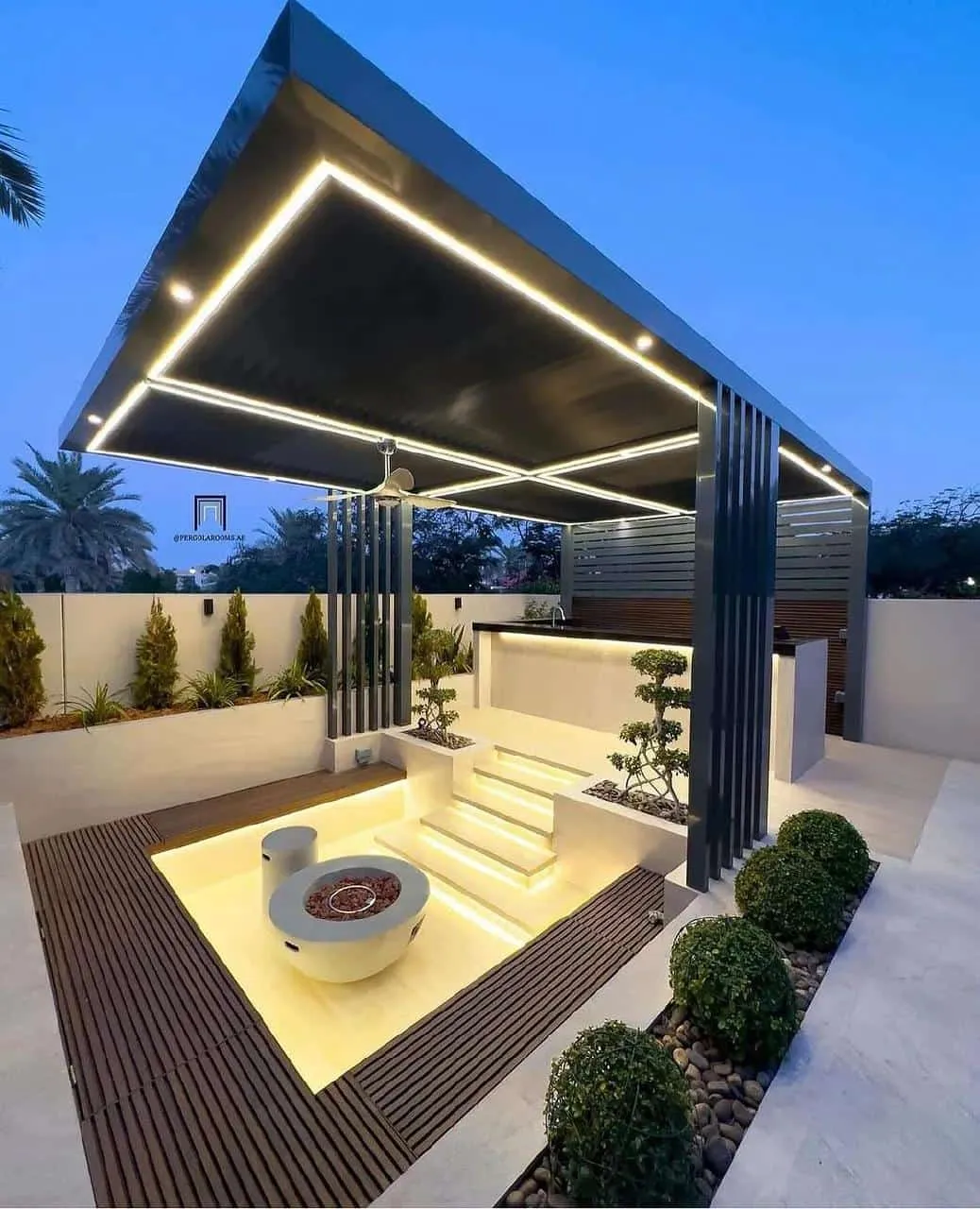 - الإضاءة المخفية : دمج شرائط إضاءة LED طولية داخل هيكل خشب أو معدن البرجولة نفسها بدلاً من تثبيتها خارجياً، لتعزيز الجمالية الراقية وتوفير إضاءة محيطية دافئة وموجهة للجلسات المسائية.