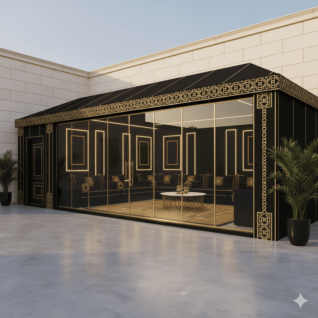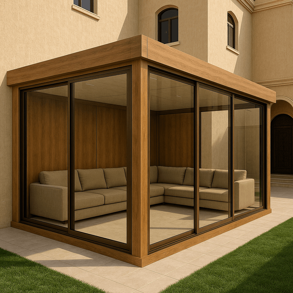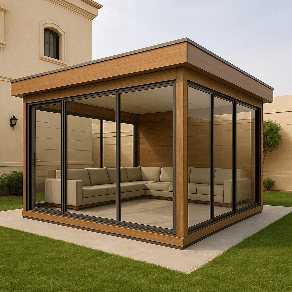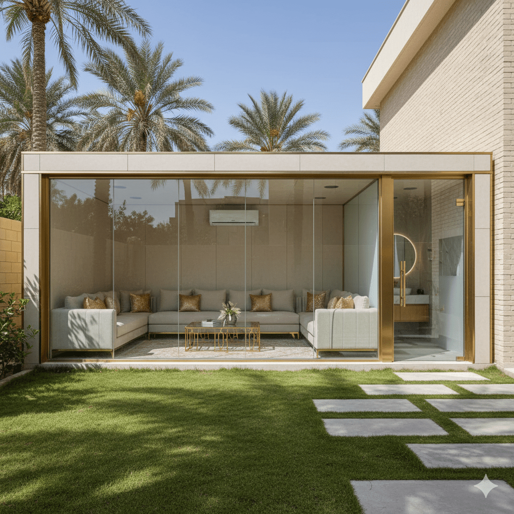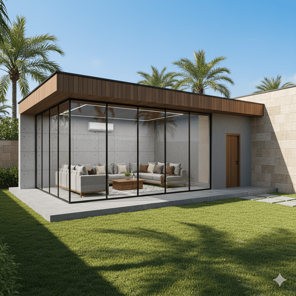 - تصغير المساحة: اختر تصميمًا لمجلس صغير أو متوسط (مثل 4م × 5م) بدلاً من البناء الكبير. التوفير في مساحة البناء ينعكس مباشرة على كمية الزجاج والإطارات المطلوبة.