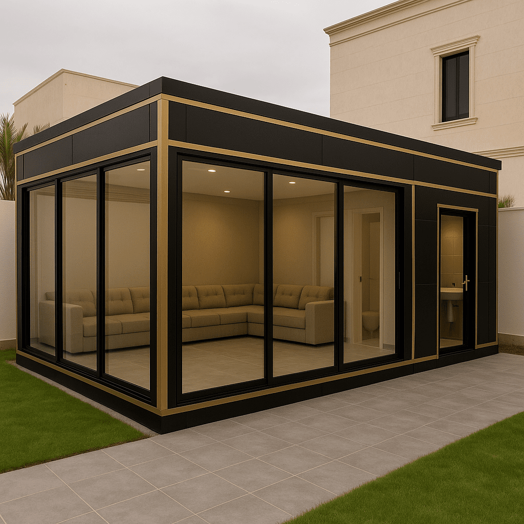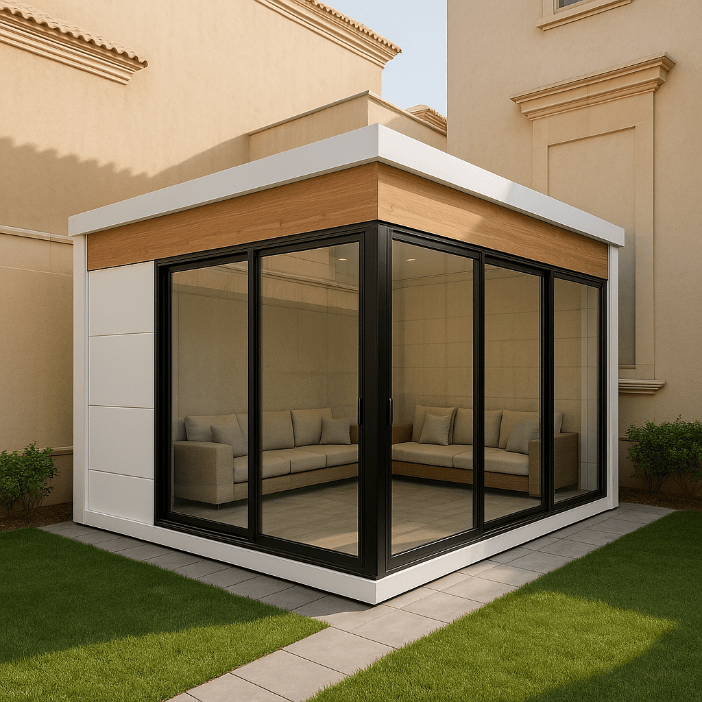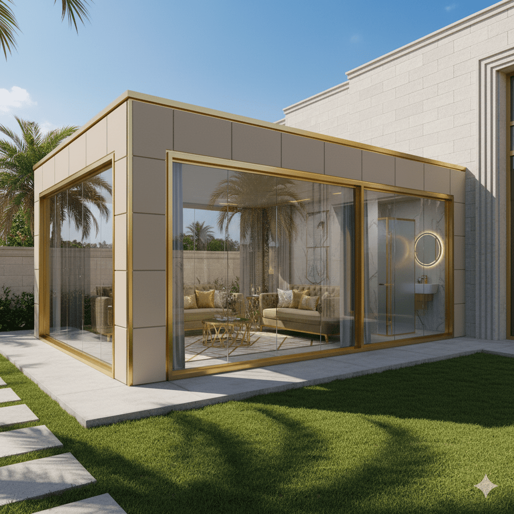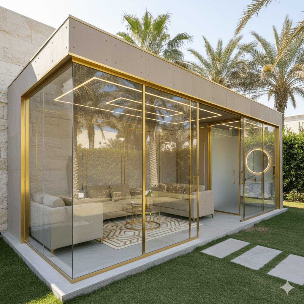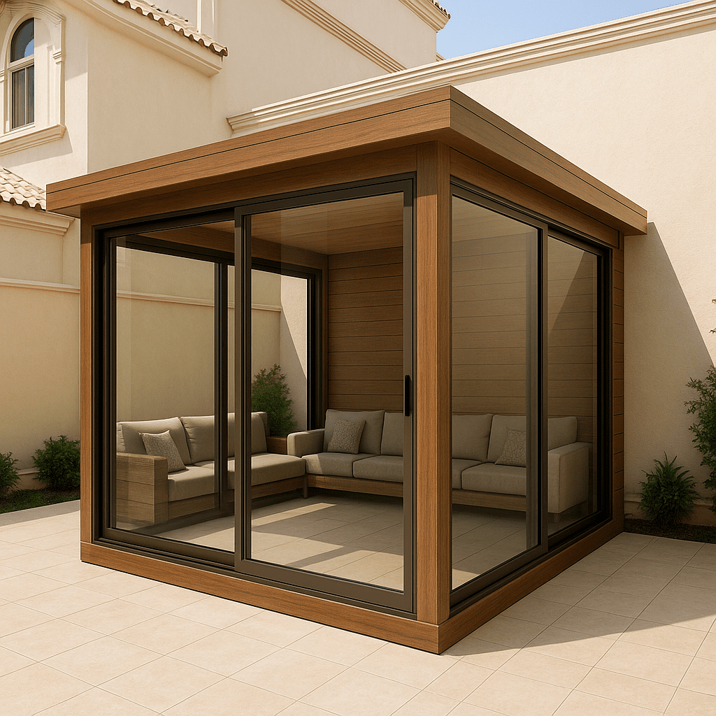 - تصغير المساحة: اختر تصميمًا لمجلس صغير أو متوسط (مثل 4م × 5م) بدلاً من البناء الكبير. التوفير في مساحة البناء ينعكس مباشرة على كمية الزجاج والإطارات المطلوبة.