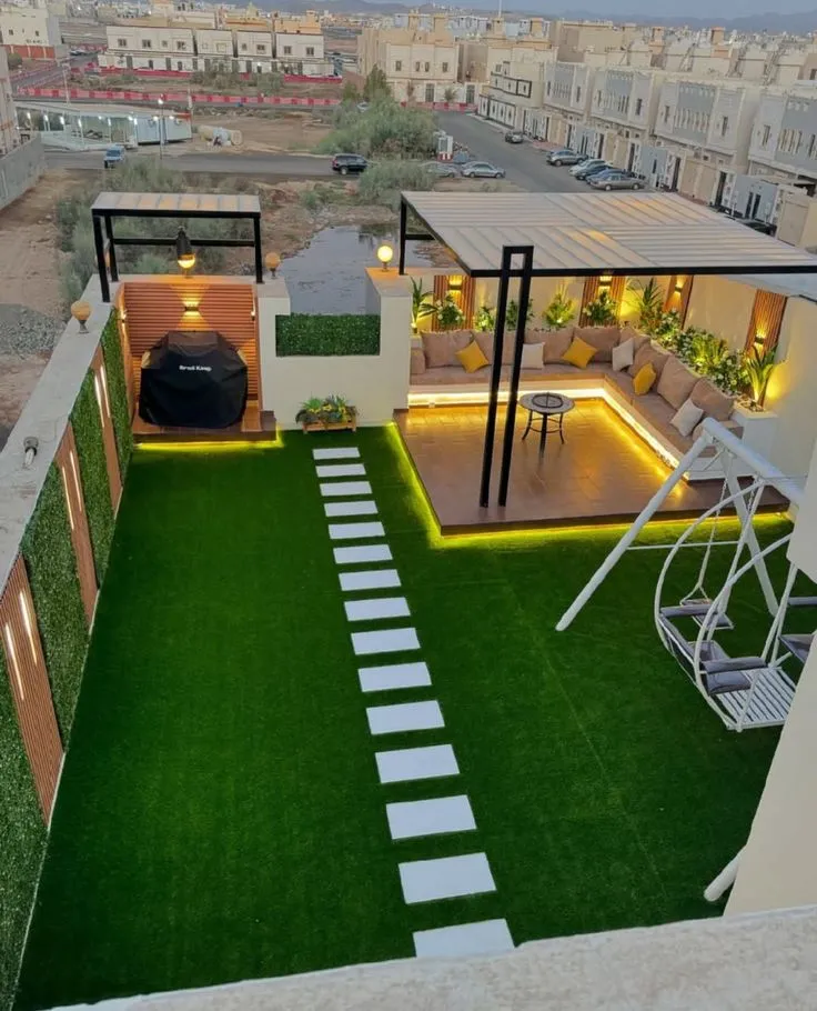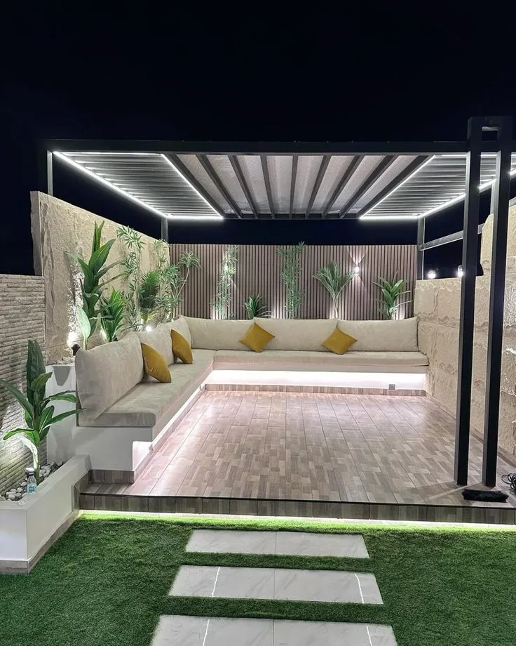 - الإضاءة الساحرة: استخدم إضاءة خافتةمعلقة على العوارض، أو مصابيح أرضية مخفية لإضفاء جو دافئ ورومانسي في المساء.
