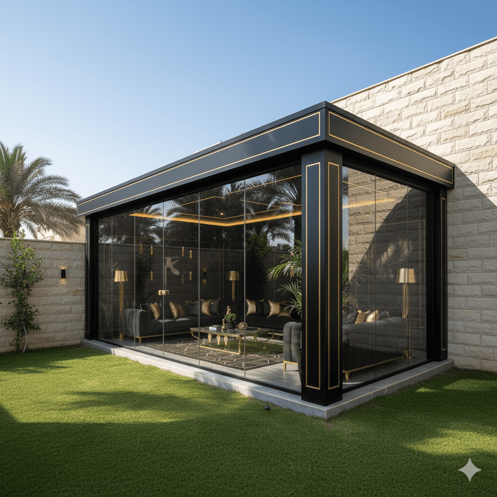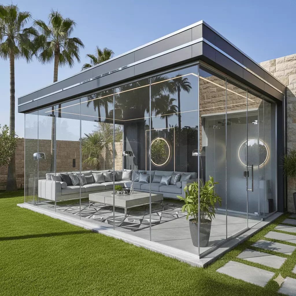 • ​التصميم الزجاجي : استخدام الواجهات الزجاجية الكبيرة التي تطل على الحديقة أو المسبح يمنح شعوراً بالاتساع والفخامة.